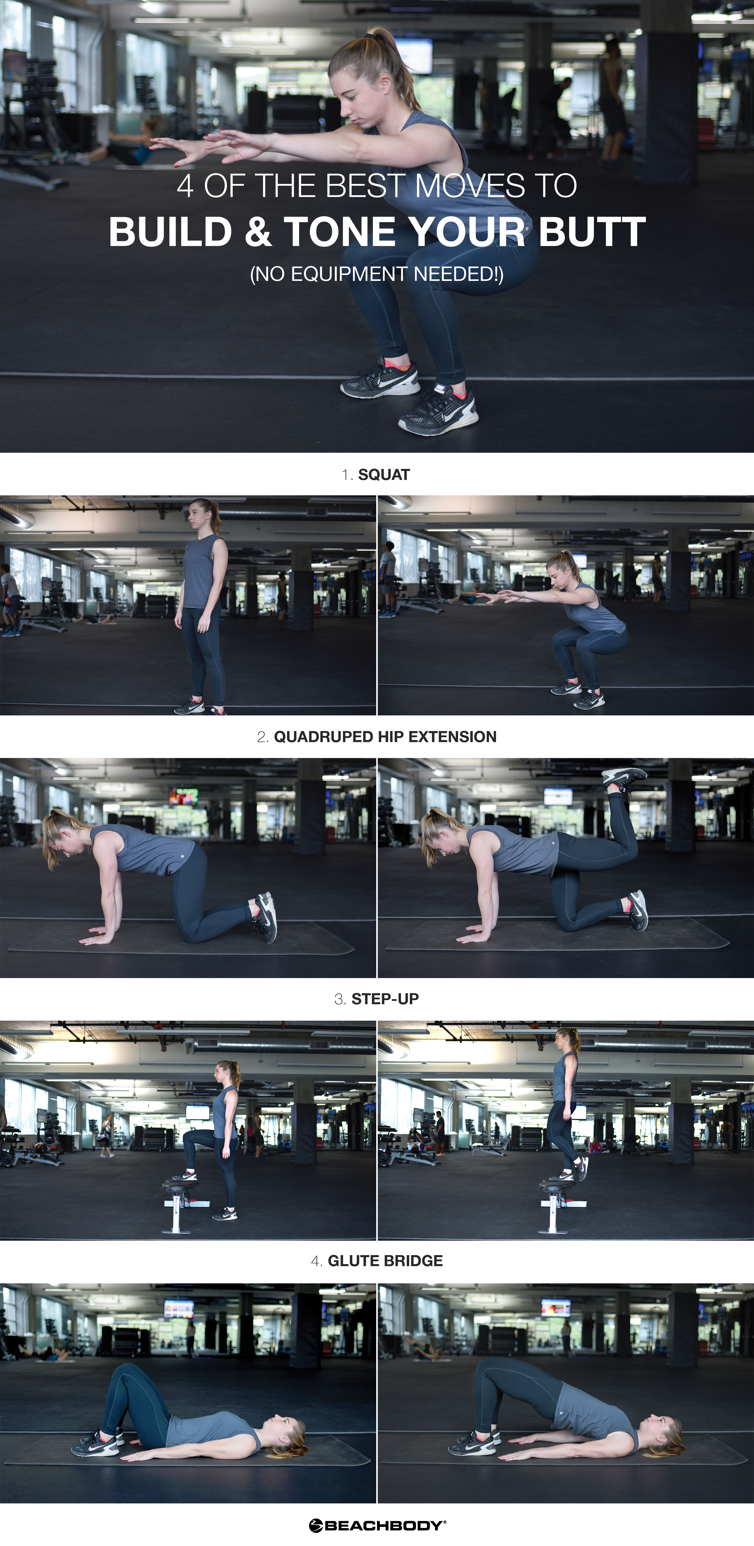 It’s the first word out of many fitness professionals’ mouths when asked about bolstering bootyliciousness, and its popularity is well deserved. It’s an extremely effective butt builder, and if you’re a strength-training newbie, you can start with bodyweight squats in the comfort of your own home — no equipment necessary!“To maximize the effectiveness of the squat, you have to feel your glutes throughout the movement,” says Trevor Thieme, C.S.C.S., Beachbody’s fitness and nutrition content manager. “Actively engage them—don’t just drop down and stand back up mindlessly.”